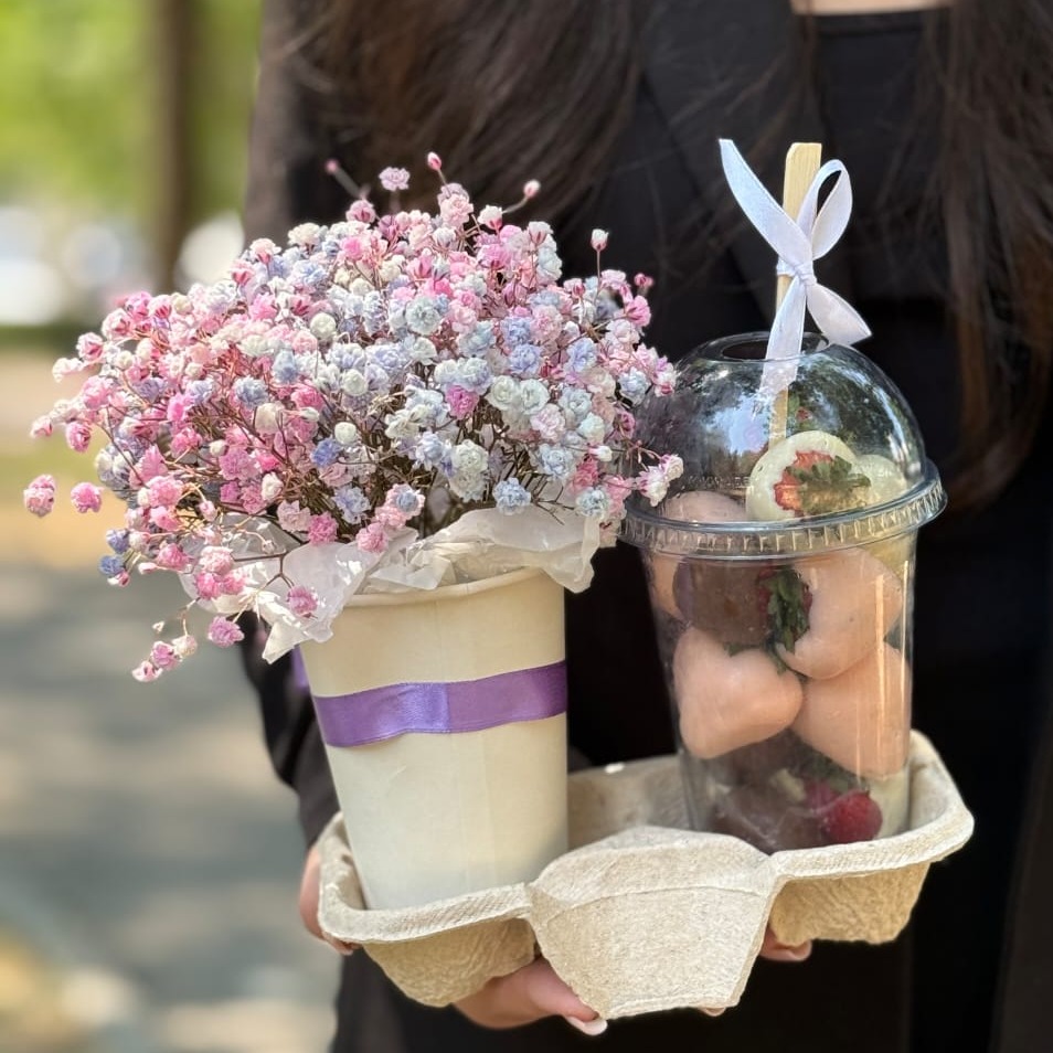 Клубника в шоколаде в стаканчике с композицией из гипсофилы – это не просто десерт, это настоящее искусство, воплощенное в сладком шедевре. Каждый стаканчик наполнен сочными ягодами клубники, облит...