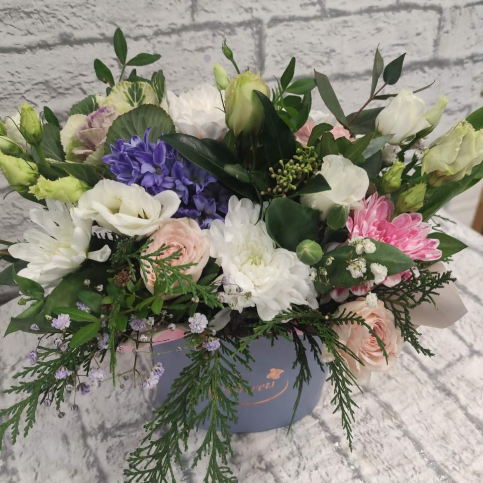 Шляпная коробка с цветами «Комплимент» из эустом и альстромерий