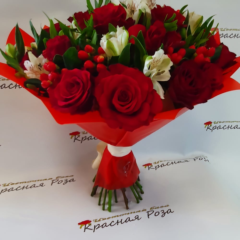 Букет из красной розы и альстромерии с добавлением ягод гиперикум.