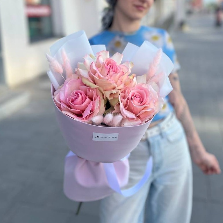 Этот нежный и элегантный букет состоит из изысканных роз эсперанса и лагуруса. Он упакован в стильную упаковку из фоамирана и украшен атласной лентой, придавая ему особый шарм и изысканность. Идеальный выбор для особых моментов и нежных подарков.