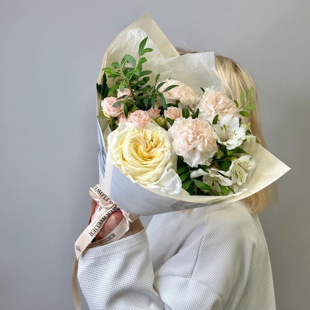 Букет «Комплимент с пионовидными розами» из гвоздик и альстромерий