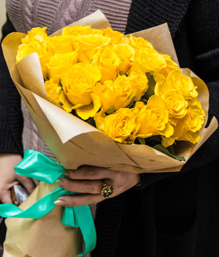 Букет из 25 Кенийских роз в крафтовой упаковке, подвязанный атласной лентой