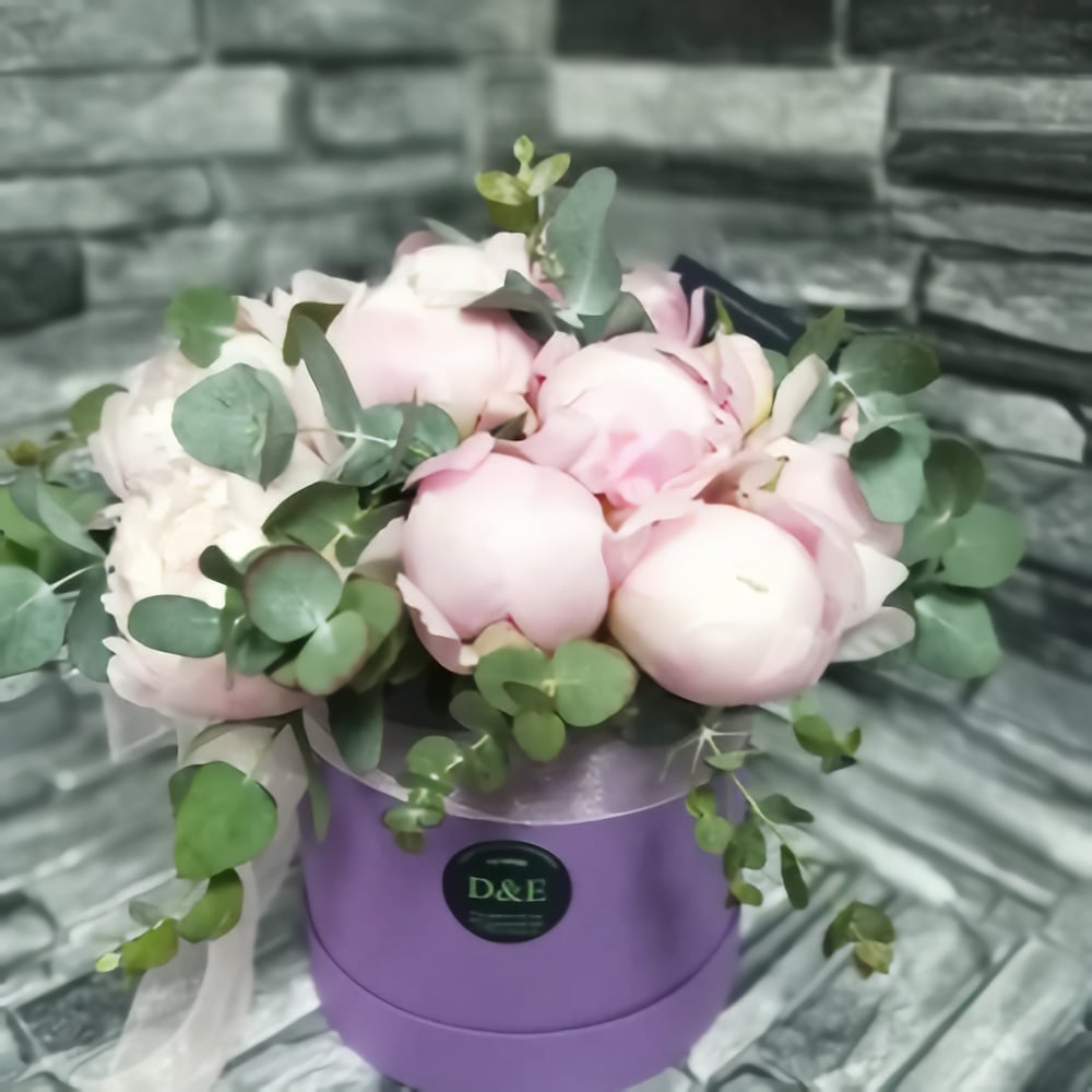 Шляпная коробка с цветами «Композиция Сиреневая дымка» из пионов