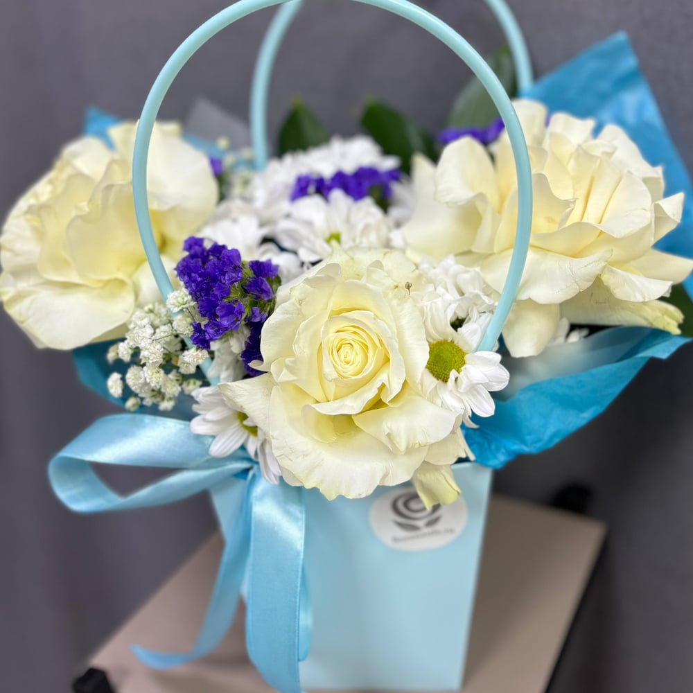 Прекрасная композиция сияет своими яркими цветами. Дополнительно украшенный статицей, которая добавляет композиции изысканности. Все цветы упакованы в стильную сумку, что делает этот букет идеальн...