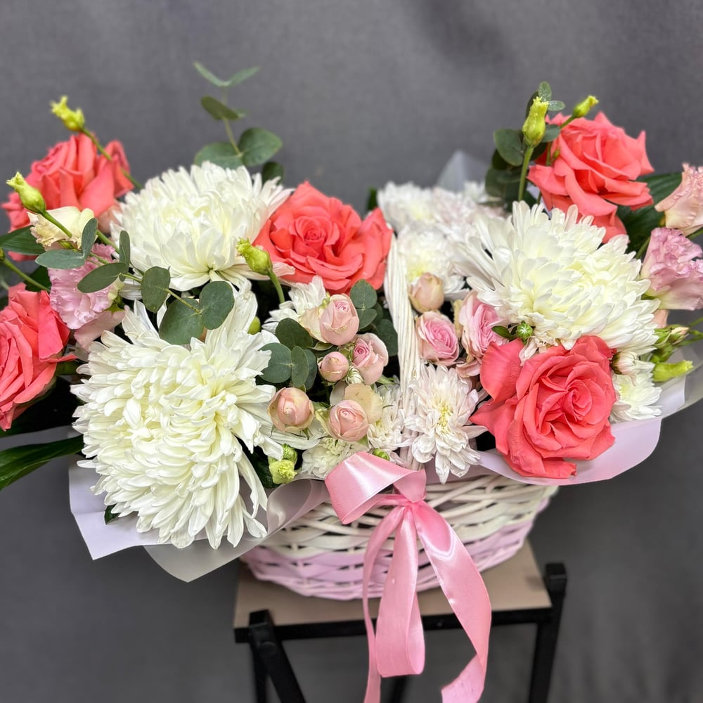 В этой изящной композиции сочетаются нежные розы, яркие хризантемы и ароматная эустома. Дополняют композицию веточки эвкалипта, которые создают особую атмосферу свежести и нежности. Все это умело собрано в стильной корзине, придающей композиции особый шарм и утонченность. Эта композиция станет прекрасным подарком для любого повода и порадует своего получателя своей красотой и изысканностью.