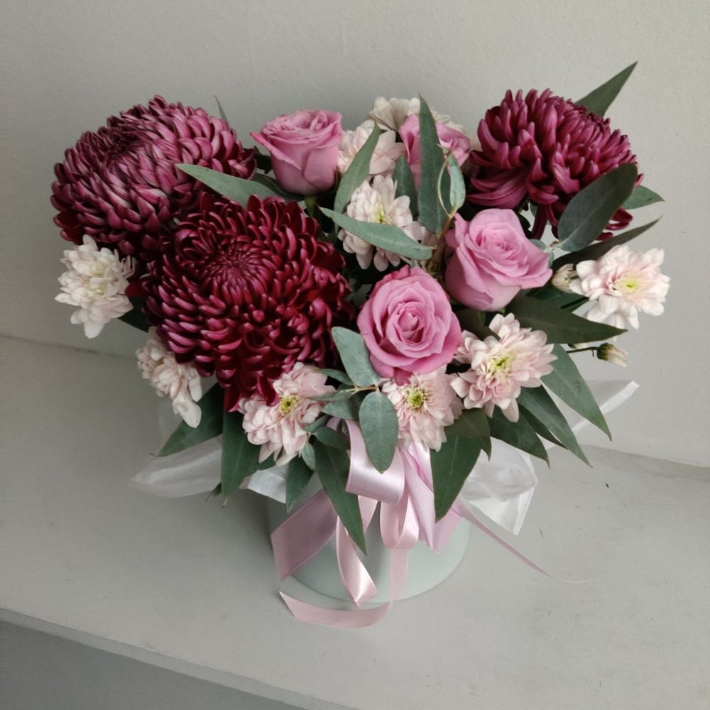 Шляпная коробка с цветами «Композиция хризантемы Бигуди и розы»