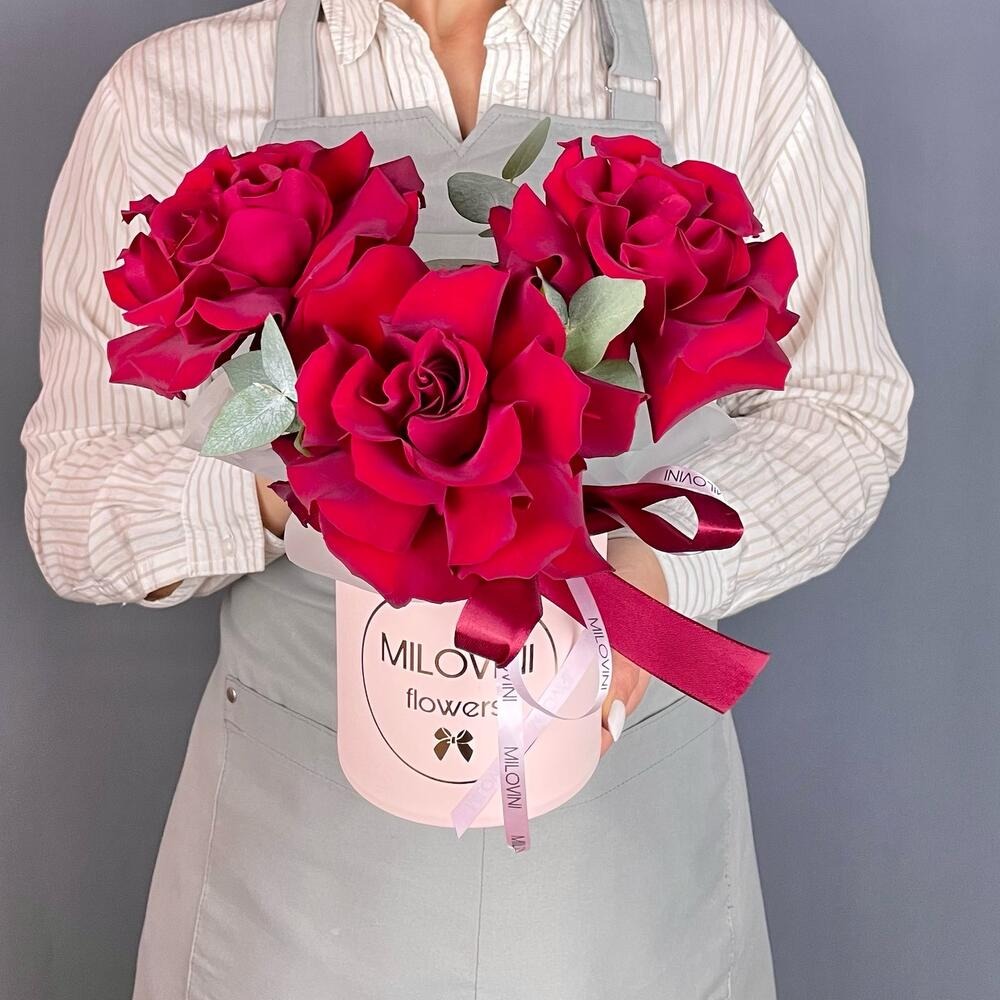 Шляпная коробка с цветами «Композиция из 3 французских роз и эвкалипта 2»