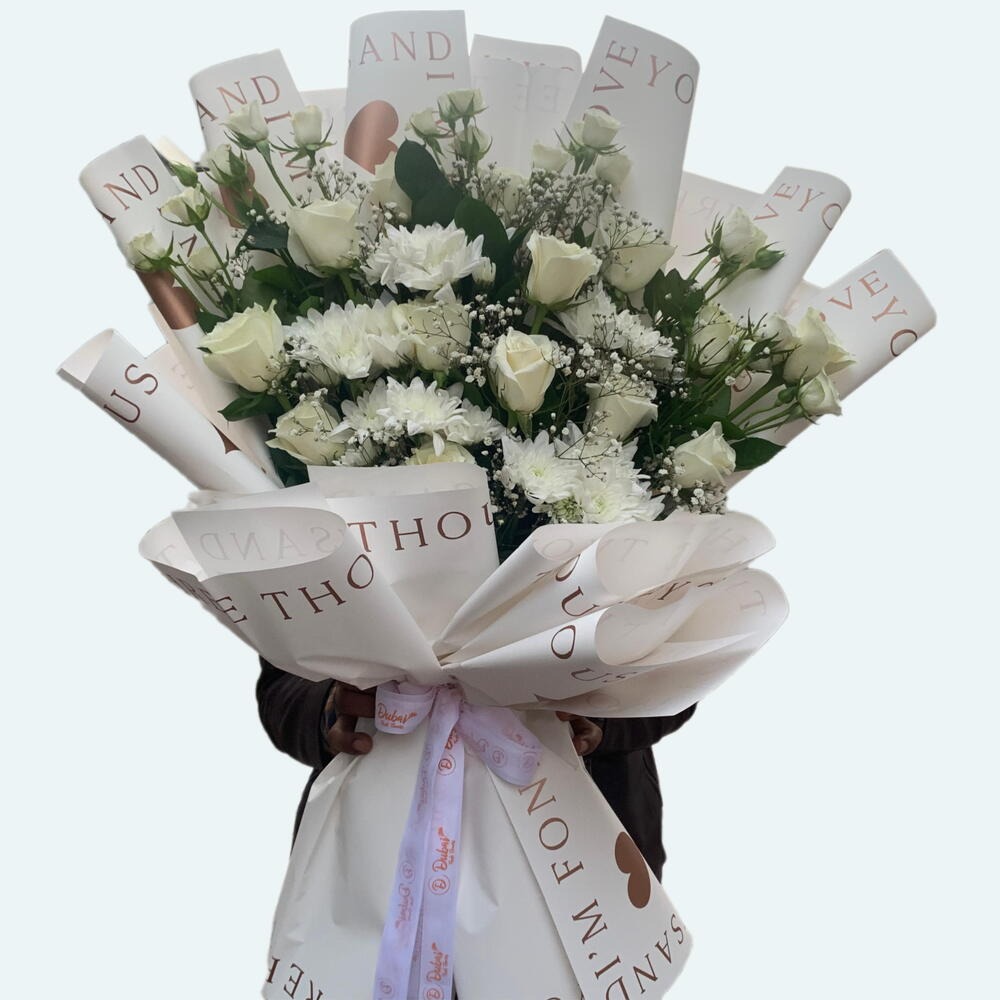 Гипсофила - 2 шт Белая хризантема - 5 шт Кустовая белая роза - 4 шт Белые розы - 10 шт