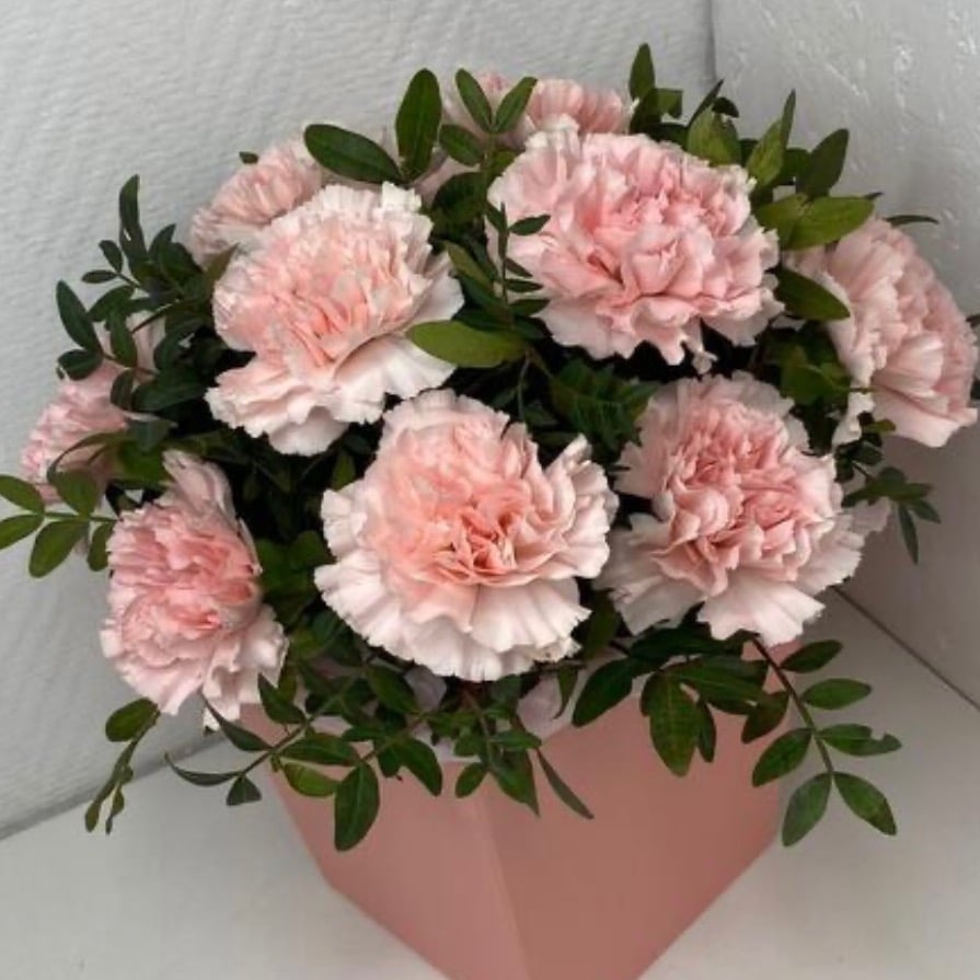 Шляпная коробка с цветами «Композиция из диантусов» из гвоздик
