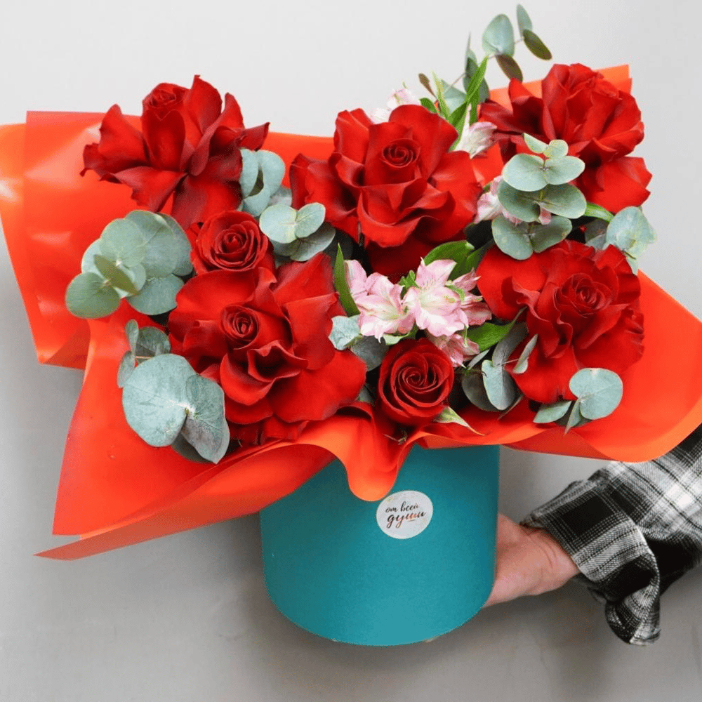Шляпная коробка с цветами «Композиция из французских красных роз» из альстромерий