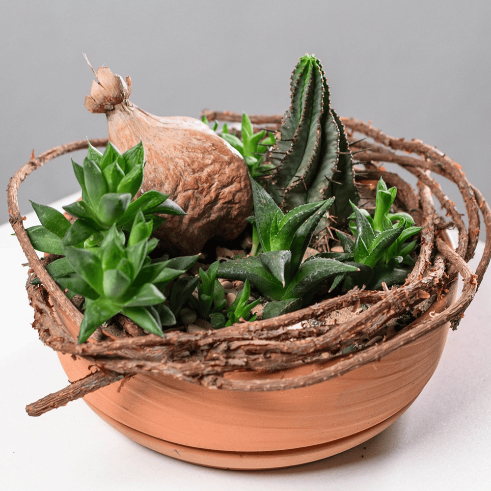 Композиция из комнатных растений на день Мамы Оригинальная композиция, созданная для тех, кто ценит стиль, природную эстетику и неприхотливость. В керамической миске собраны разные виды суккулентов! Веточки, аккуратно выложенные по кругу, напоминают природное гнездо и создают эффект мини-ландшафта.
