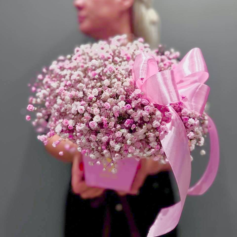 Шляпная коробка с цветами «Композиция из нежной розовой гипсофилы»