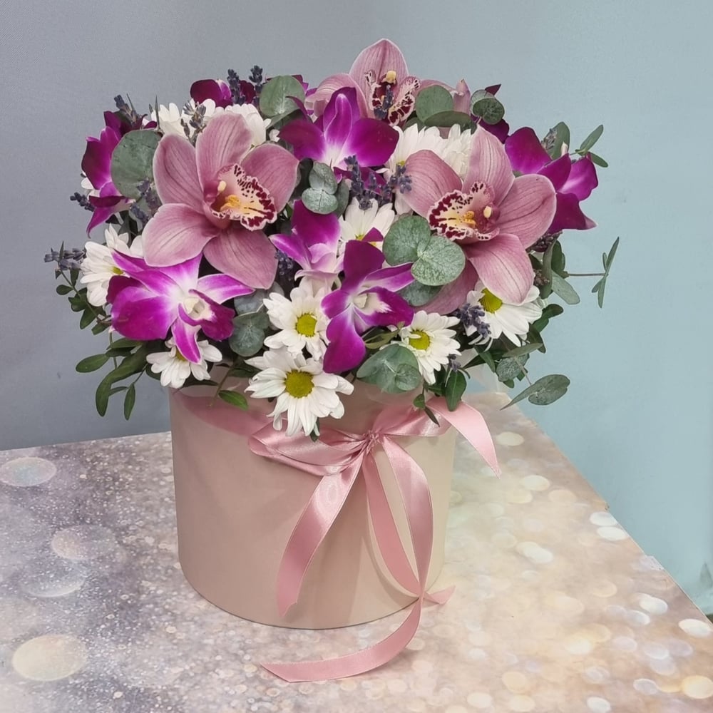 Композиция из орхидеи ромашки и лаванды в шляпной коробке на день рождения Для любимой девушки или подруге На юбилей маме или бабушке Порадует коллегу или руководителя В знак благодарности ...