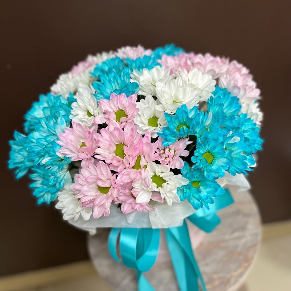 Шляпная коробка с цветами «Композиция из ромашковых хризантем»