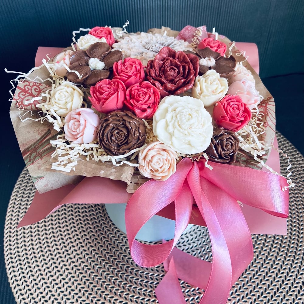 Очень милый и главное вкусный букет или точнее , композиция из шоколадных цветов сделана вручную из белого и молочного (с пищевыми красителями ) шоколада премиум Качества (бельгийский) Общий вес ш...