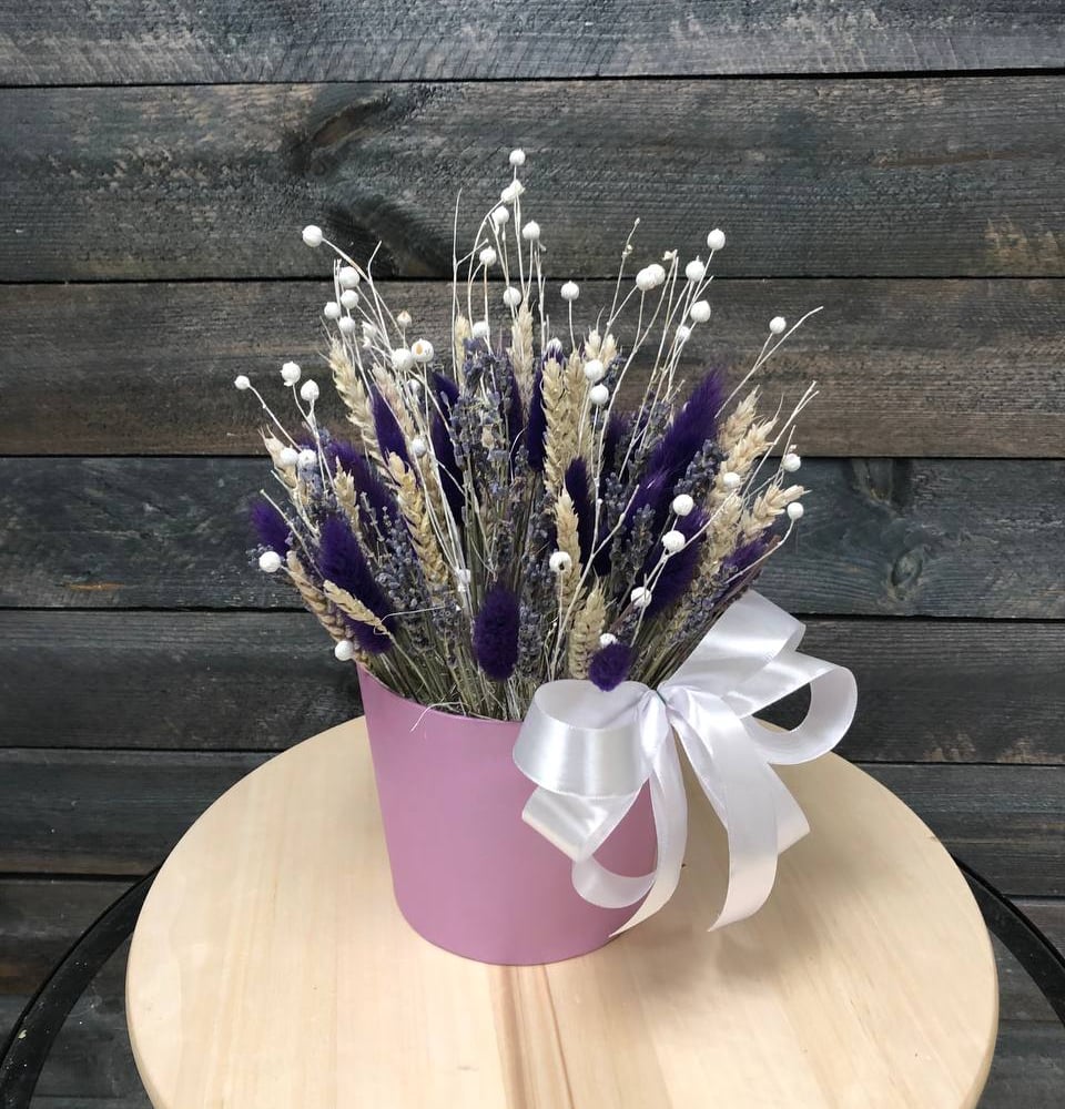 Милая композиция из сухоцветов, которая отлично подойдёт как на подарок, так и в качестве интерьерной.