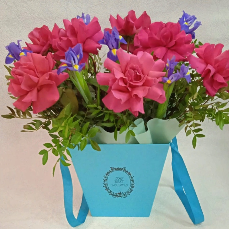 Коробка с цветами «Композиция Кантата» из роз и ирисов