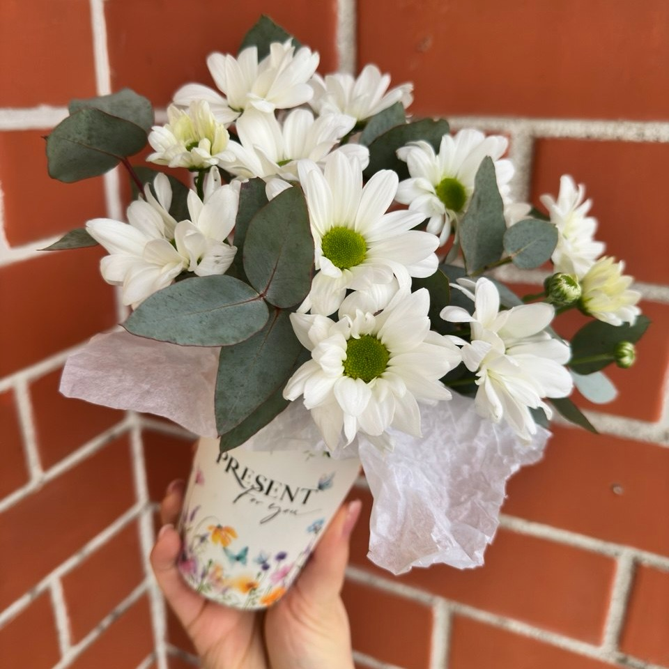 Минимализм в цветах: чистые белые хризантемы в сочетании с благородной зеленью эвкалипта создают образ утончённой элегантности.Идеально подходит для корпоративных подарков-комплементов !