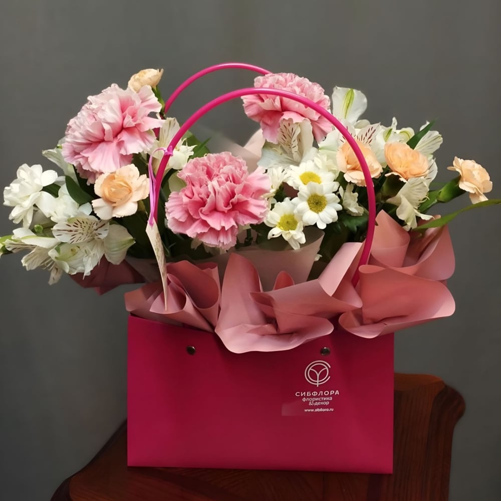 Изысканная композиция в красной сумочке Madame Totem in red, словно в сердце, притаившем самые нежные тайны, расцвела удивительная цветочная композиция, которая способна покорить даже самое охладевшее сердце. Каждый цветок, каждый лепесток здесь рассказывает свою романтическую историю, переплетаясь в едином танце, полном чувственности. ⠀⠀ Состав: диантус - 3 шт., диантус кустовой - 2 шт., альстромерия - 2 шт., хризантема кустовая Сантини - 2 шт., пиофлор, сумочка, упаковка