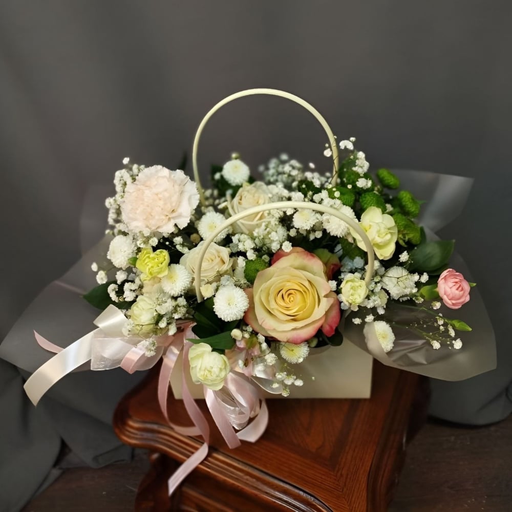 Коробка с цветами «Композиция Madame Totem in Crema» из роз и хризантем