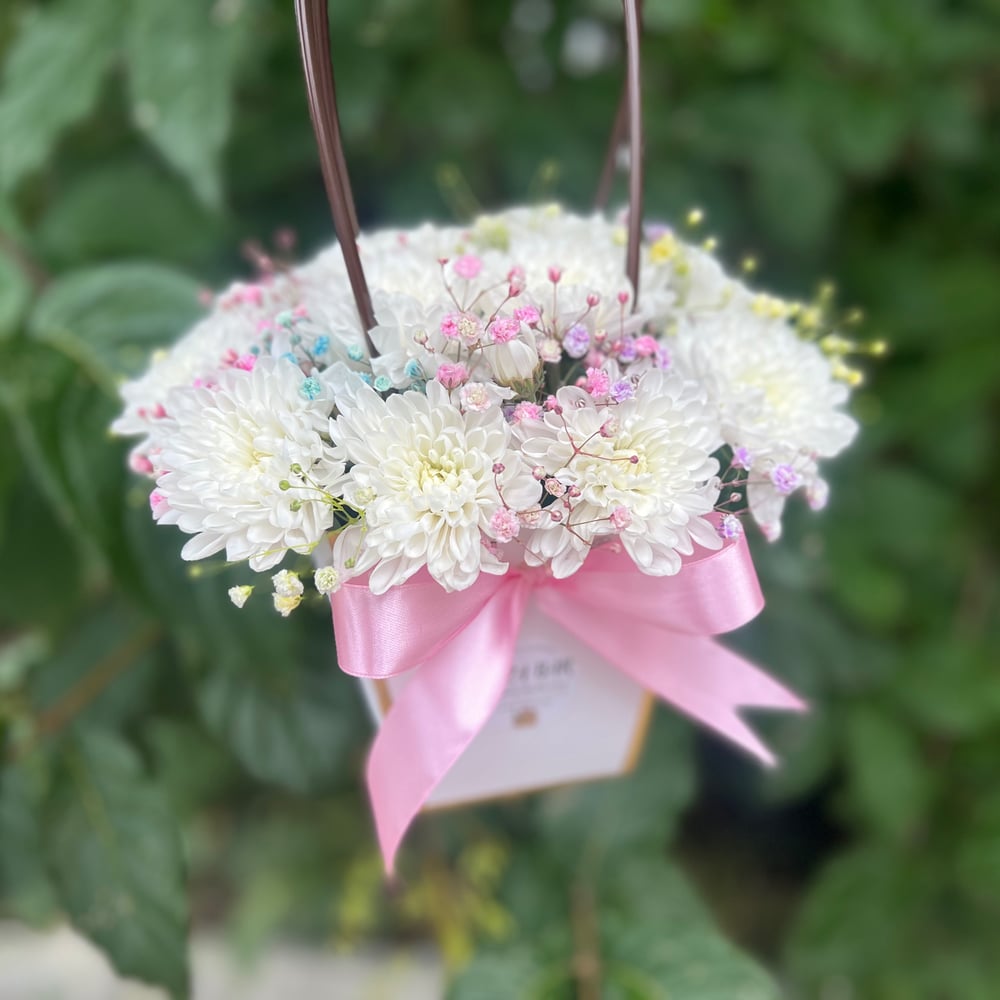 Композиция из стойких цветов в нежном оформлении