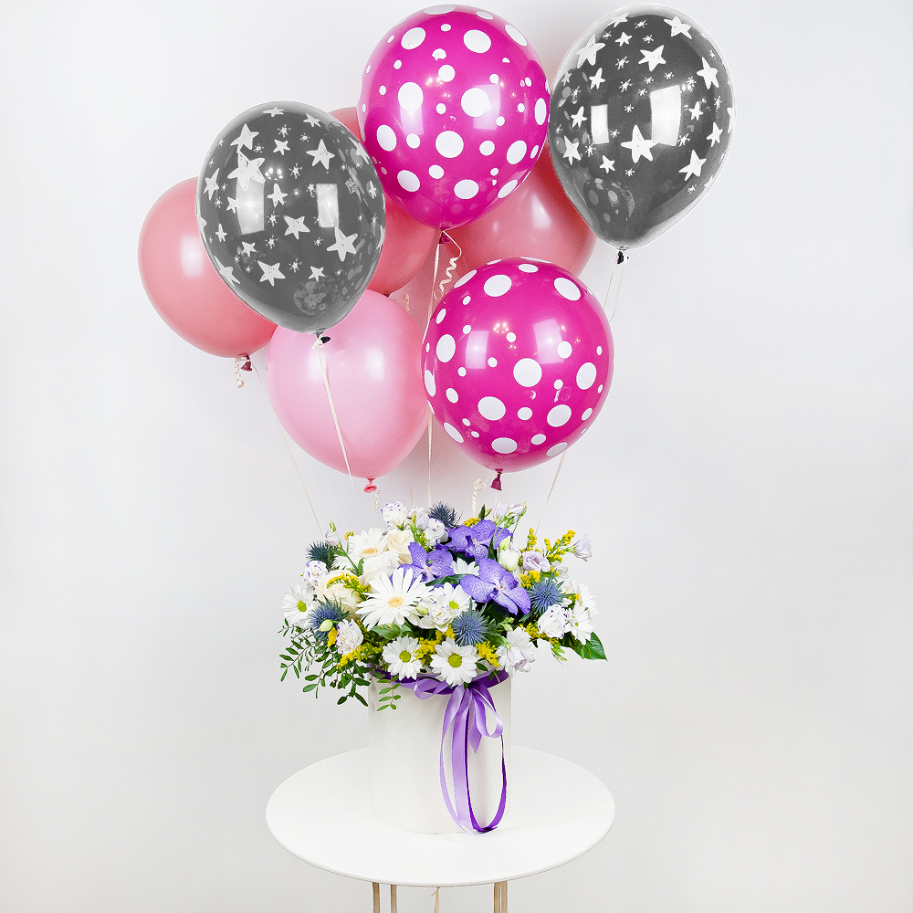 Это цветочное облачко нежности обязательно воспарит в воздух в такой замечательной компании ярких гелиевых шаров! Отправьте его особенному для вас человеку, и целое море восторга гарантировано!