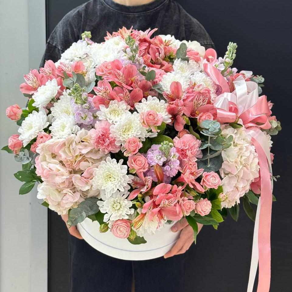 Нежная и стильная композиция из маттиолы, хризантем, гвоздики, гортензии, роз, эвкалипта, альстромерии и рускуса, собранная в шляпной коробке, создаст атмосферу уюта и радости, окутает теплом, . Он...