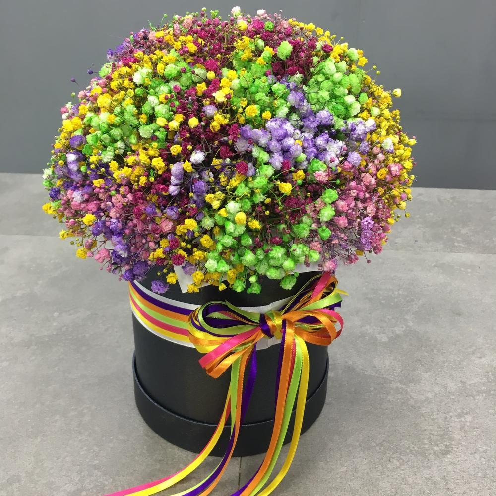 Шляпная коробка с цветами «Композиция Радужной Гипсофилы»