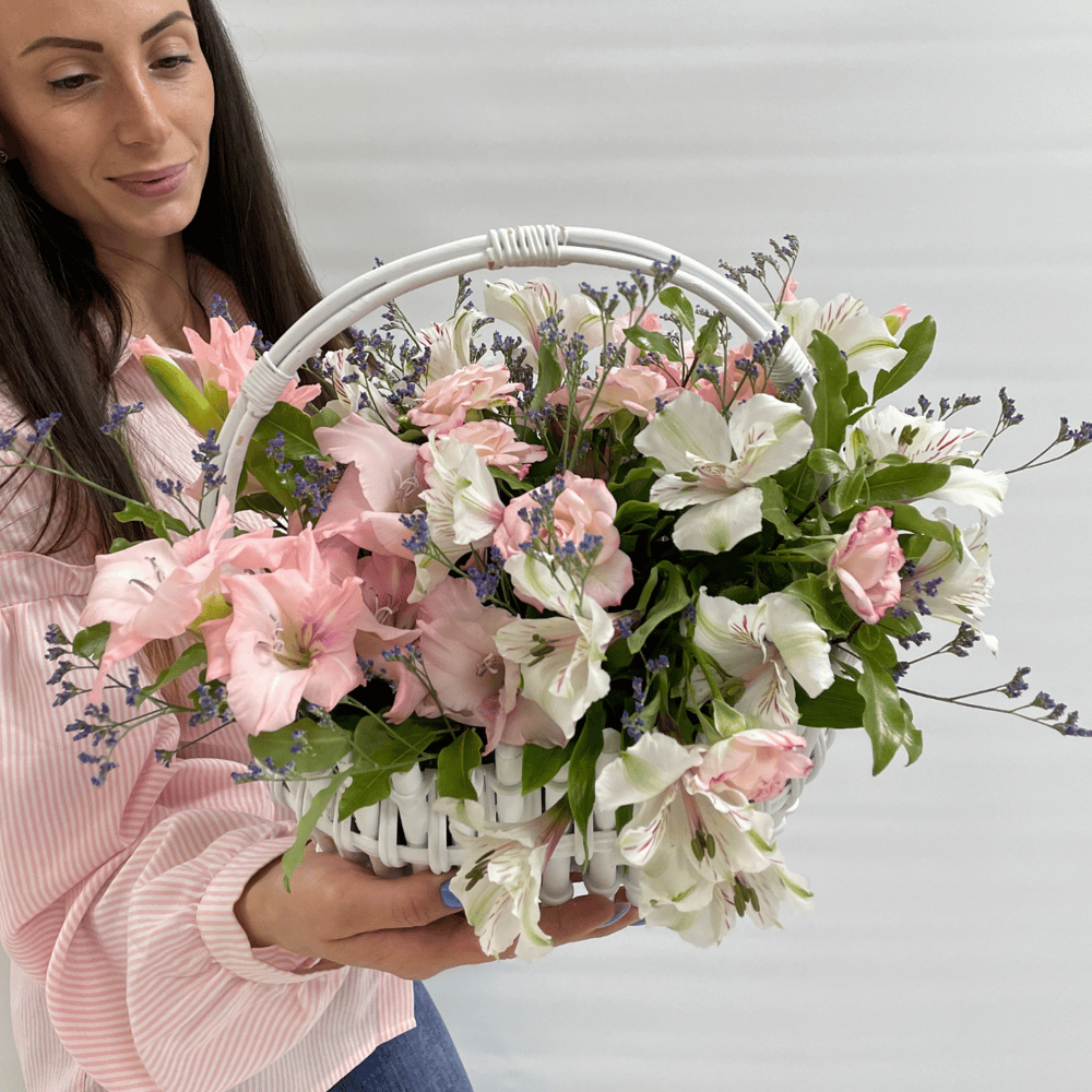 Корзина с цветами «Композиция Роз, Гладиолуса и Альстромерии»