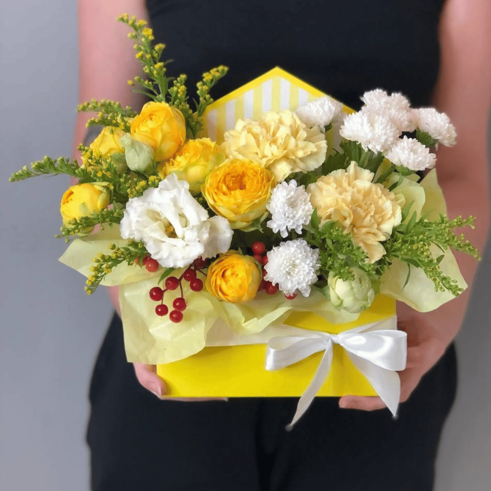 Коробка с цветами «Композиция Роз, Хризантем и Диантусов»