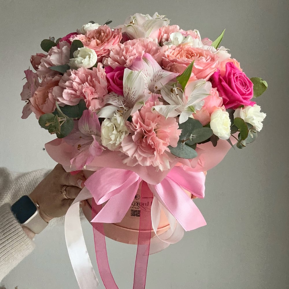 Шляпная коробка с цветами «Композиция с диантусами розовая» из альстромерий
