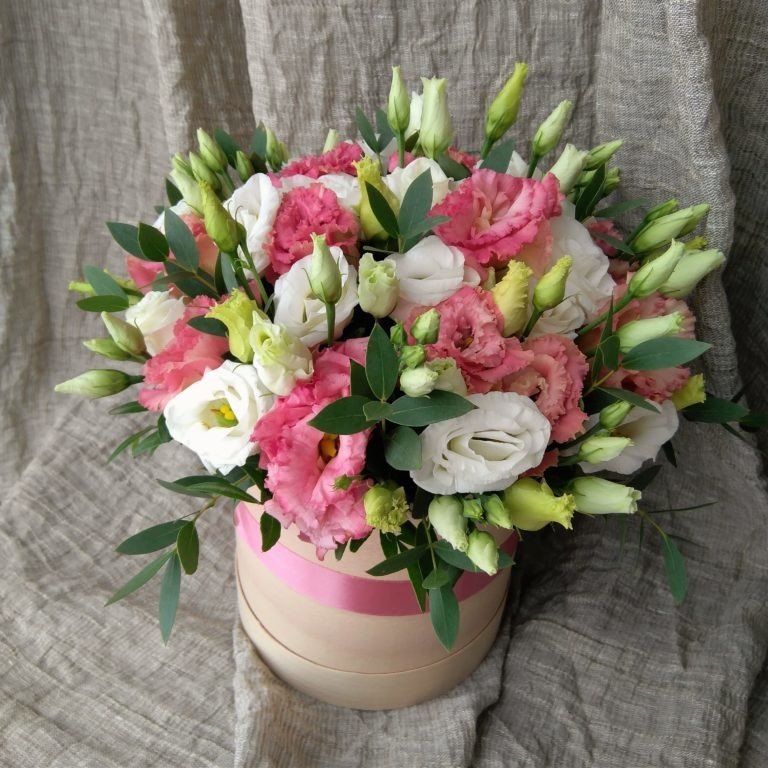 Цветочная композиция с эустомой и зеленью в шляпной коробке, перевязанной лентой. При отсутствии некоторых видов и расцветки цветов, компания оставляет за собой право осуществить равноценную замену по согласованию с заказчиком» Каждый букет и композиция может отличаться от исходного варианта, так как каждый букет и композиция уникальны и индивидуальны. Результат будет максимально приближен к образцу.