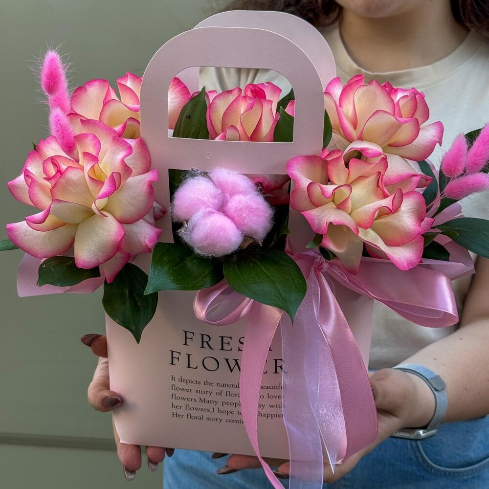Нежное сияние – это не просто цветы, это воплощение утонченности и изящества. В композиции представлены розы с уникальной двухцветной окраской – кремово-белые лепестки, обрамленные нежным розовым отт…