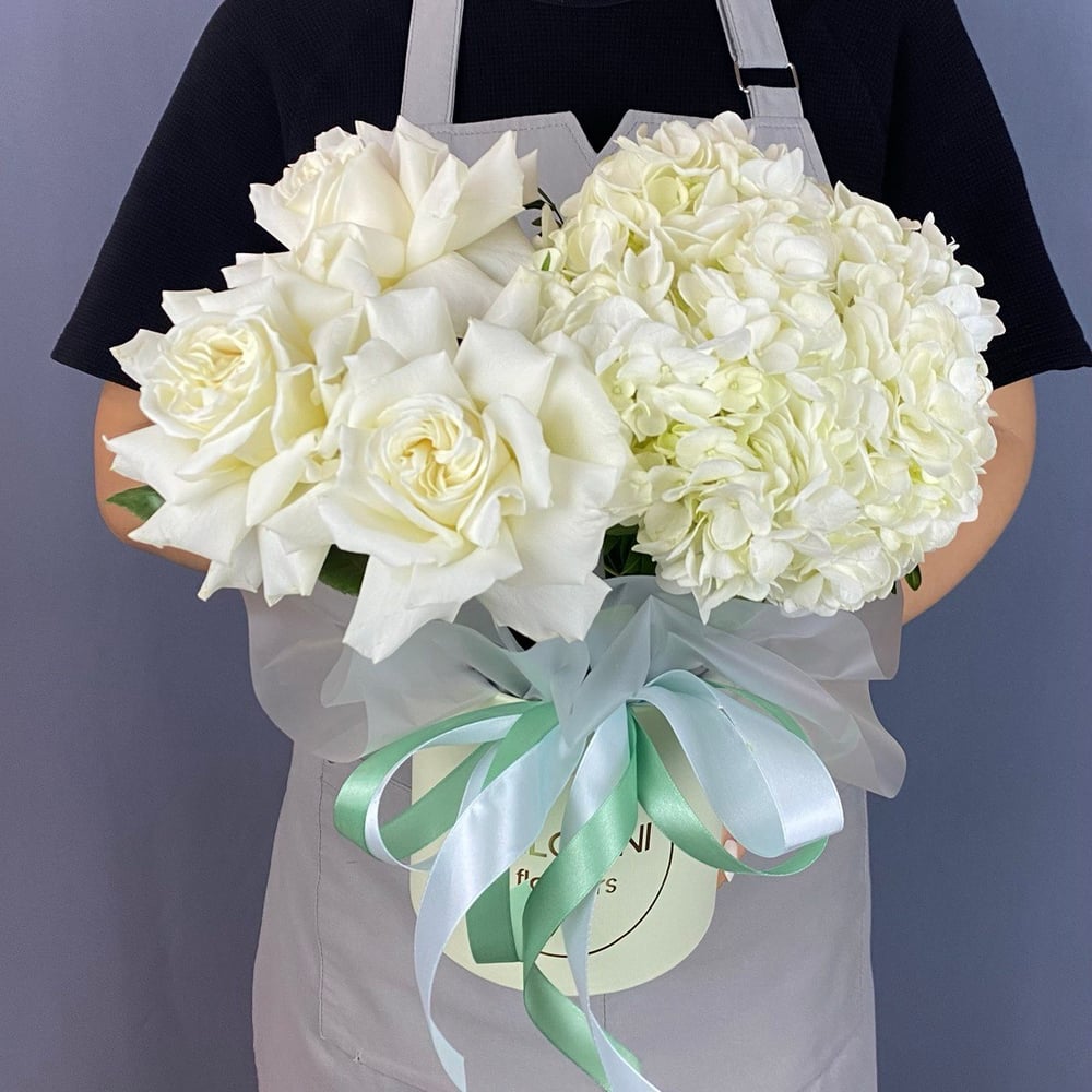 Невероятныая композиция с французскими розами и гортензией❤️ Станет классным подарком на день рождения, юбилей, свадьбу, помолвку, а также приятным сюрпризом без повода😇 Букет подойдёт в подарок для любимой женщины, мамы, бабушки, коллеги, учителя, делового партнера или же подруги • КЭШБЭК 5% с каждой покупки бонусами; • Молниеносная доставка; • Всегда свежие цветы за счет прямых поставок каждые 2 дня; • Быстрая сборка букетов от 10 минут; • Удобрение для цветов к каждому заказу; Советы по уходу: ⁃ Перед тем, как поставить цветы в холодную воду, стебли необходимо подрезать на 1 см под острым углом; ⁃ Менять воду необходимо каждые два дня; ⁃ Цветы хорошо себя чувствуют в прохладном месте, вдали от отопительных приборов, сквозняков и солнечных лучей; ⁃ Сухие и увядающие листья и бутоны необходимо удалять, так как они поглащают питательные вещества; ⁃ Композицию в коробке/корзине/лукошке так же необходимо поливать раз в два дня, в центр достаточно подлить 1/2 стакана прохладной воды🙏🏻 Будем рады принять Ваш заказ и подарить Вам незабываемые эмоции🥰