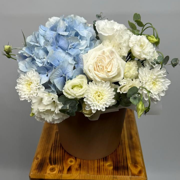 Шляпная коробка с цветами «Композиция с голубой гортензией» из хризантем и эустом