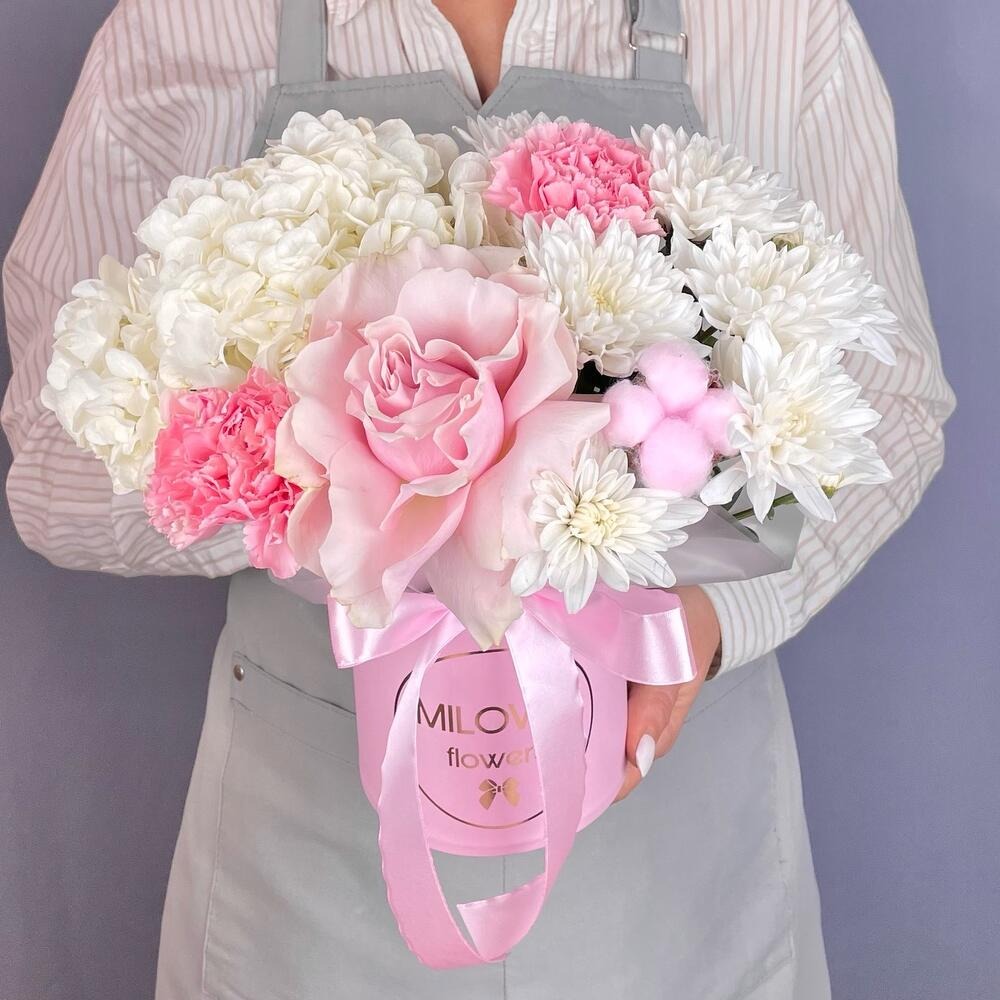 Невероятная композиция с гортензией, хризантемой и розой❤️ Станет классным подарком на день рождения, юбилей, свадьбу, помолвку, а также приятным сюрпризом без повода😇 Букет подойдёт в подарок для любимой женщины, мамы, бабушки, коллеги, учителя, делового партнера или же подруги • КЭШБЭК 5% с каждой покупки бонусами; • Молниеносная доставка; • Всегда свежие цветы за счет прямых поставок каждые 2 дня; • Быстрая сборка букетов от 10 минут; • Удобрение для цветов к каждому заказу; Советы по уходу: ⁃ Перед тем, как поставить цветы в холодную воду, стебли необходимо подрезать на 1 см под острым углом; ⁃ Менять воду необходимо каждые два дня; ⁃ Цветы хорошо себя чувствуют в прохладном месте, вдали от отопительных приборов, сквозняков и солнечных лучей; ⁃ Сухие и увядающие листья и бутоны необходимо удалять, так как они поглащают питательные вещества; ⁃ Композицию в коробке/корзине/лукошке так же необходимо поливать раз в два дня, в центр достаточно подлить 1/2 стакана прохладной воды🙏🏻 Будем рады принять Ваш заказ и подарить Вам незабываемые эмоции🥰