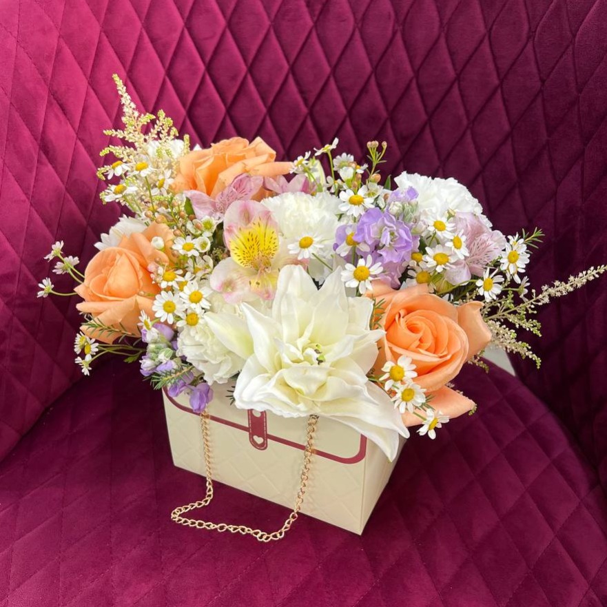 Коробка с цветами «Композиция с лилией, розами и ромашками»