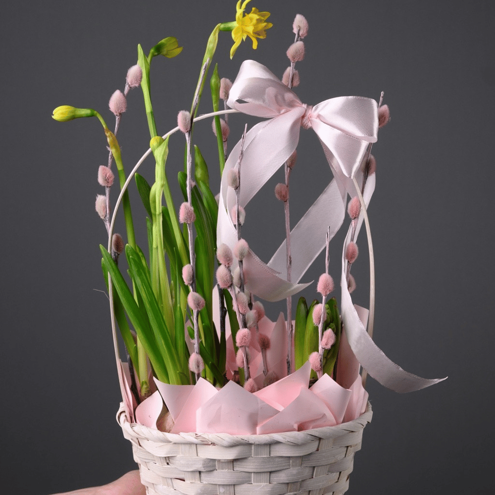Корзина с цветами «Композиция с первоцветами вдохновение» из экзотических цветов