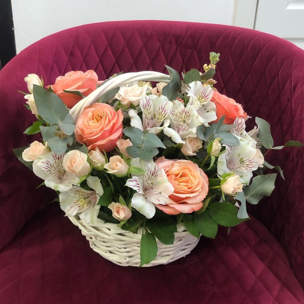 Композиция в корзине с пионовидными розами, кустовыми розами и альстромериями