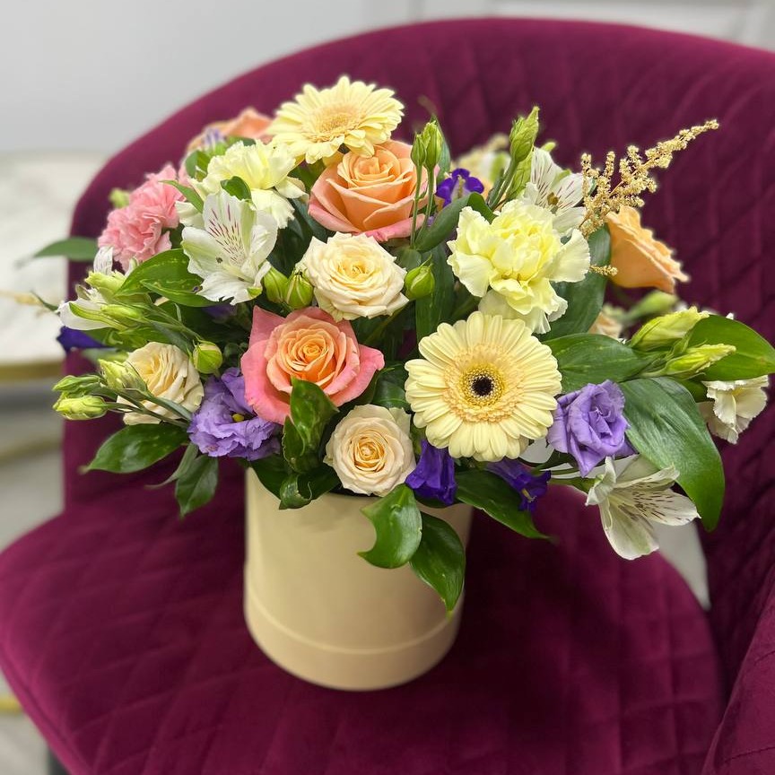 Шляпная коробка с цветами «Композиция с розами, диантусами, лизиант»