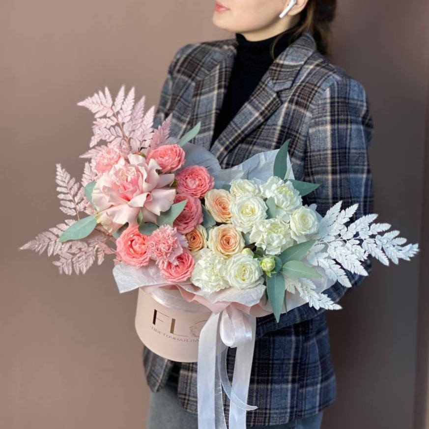 Шляпная коробка с цветами «Композиция с розово-сливочным градиентом» из гвоздик