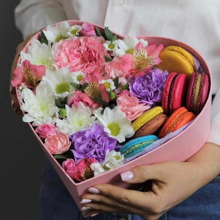 Подарочный набор «Композиция с цветами и макарунами» из хризантем и альстромерий
