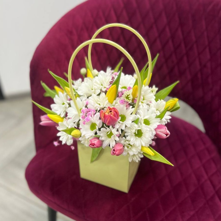 Коробка с цветами «Композиция с тюльпанами и хризантемой»