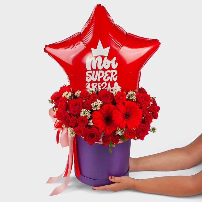 Яркий, эффектный, динамичный подарок для близкого и дорогого человека - букет в красных оттенках из роз и крупных гербер, окруженных маленькими белыми цветочками. Фиолетовая шляпная коробка и большой воздушный шар в форме звезды с приятной дарственной надписью дополняют прекрасные цветы!