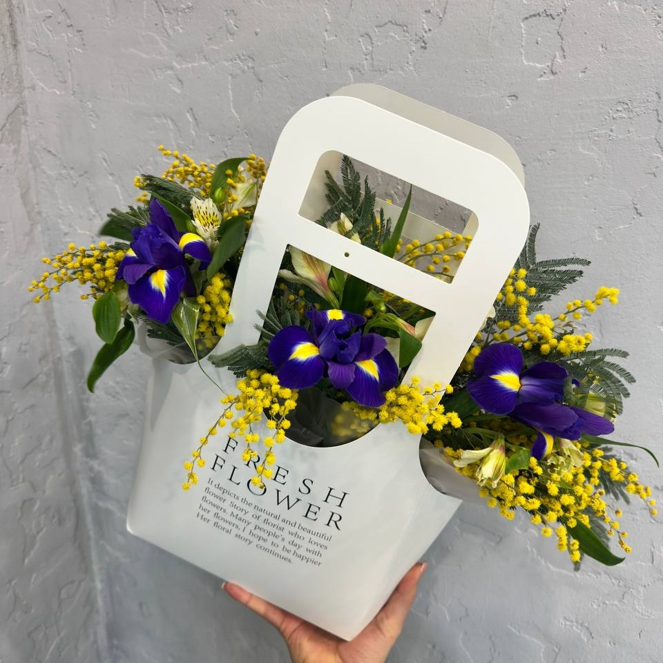 Коробка с цветами «Композиция цветов» из ирисов и мимоза
