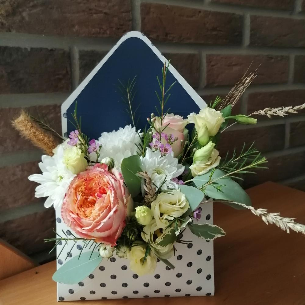 Композиция в конверте из роз и эустом