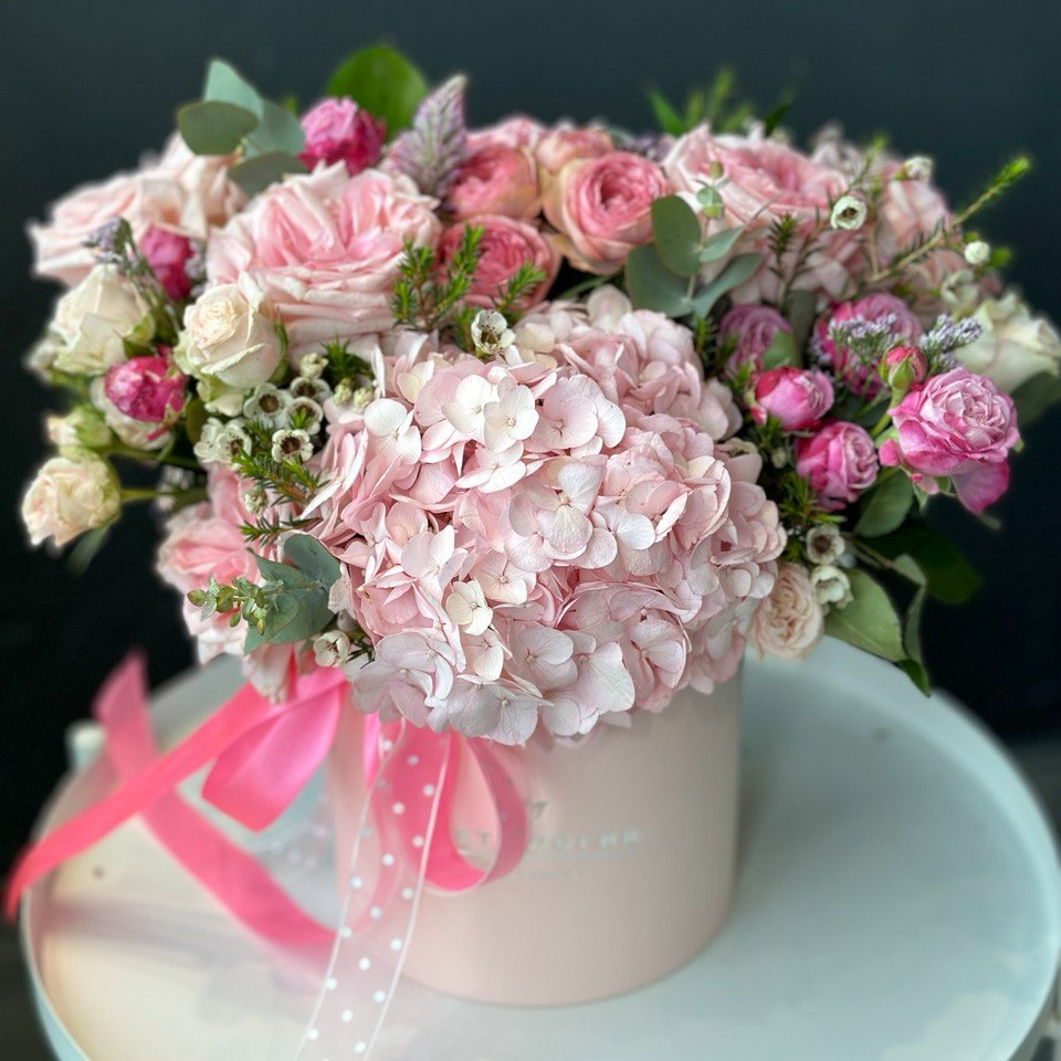 Шляпная коробка с цветами «Композиция в коробке» из роз и гортензий