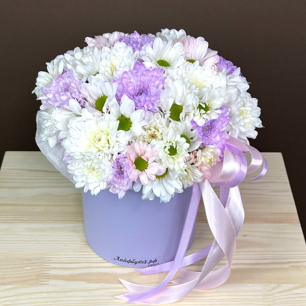 Шляпная коробка с цветами «Композиция в коробке "Лиловый вечер"» из хризантем