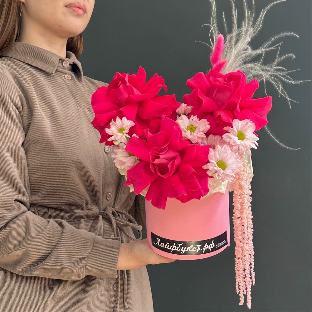 Композиция в коробке «Шепот Сердец» — это утонченное и нежное оформление, в котором главную роль играют ажурные розовые розы и кустовые хризантемы. Розы символизируют любовь, теплоту и искренн...
