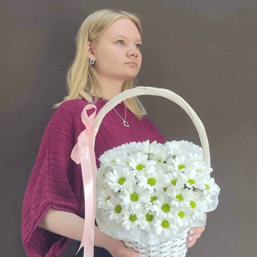 Ромашки в корзине из натуральной лозы в оазисе прекрасный подарок для романтичной натуры на День рождения маме, любимой жене, подруге или просто девушке. Хризантемы белые будут радовать получателя...